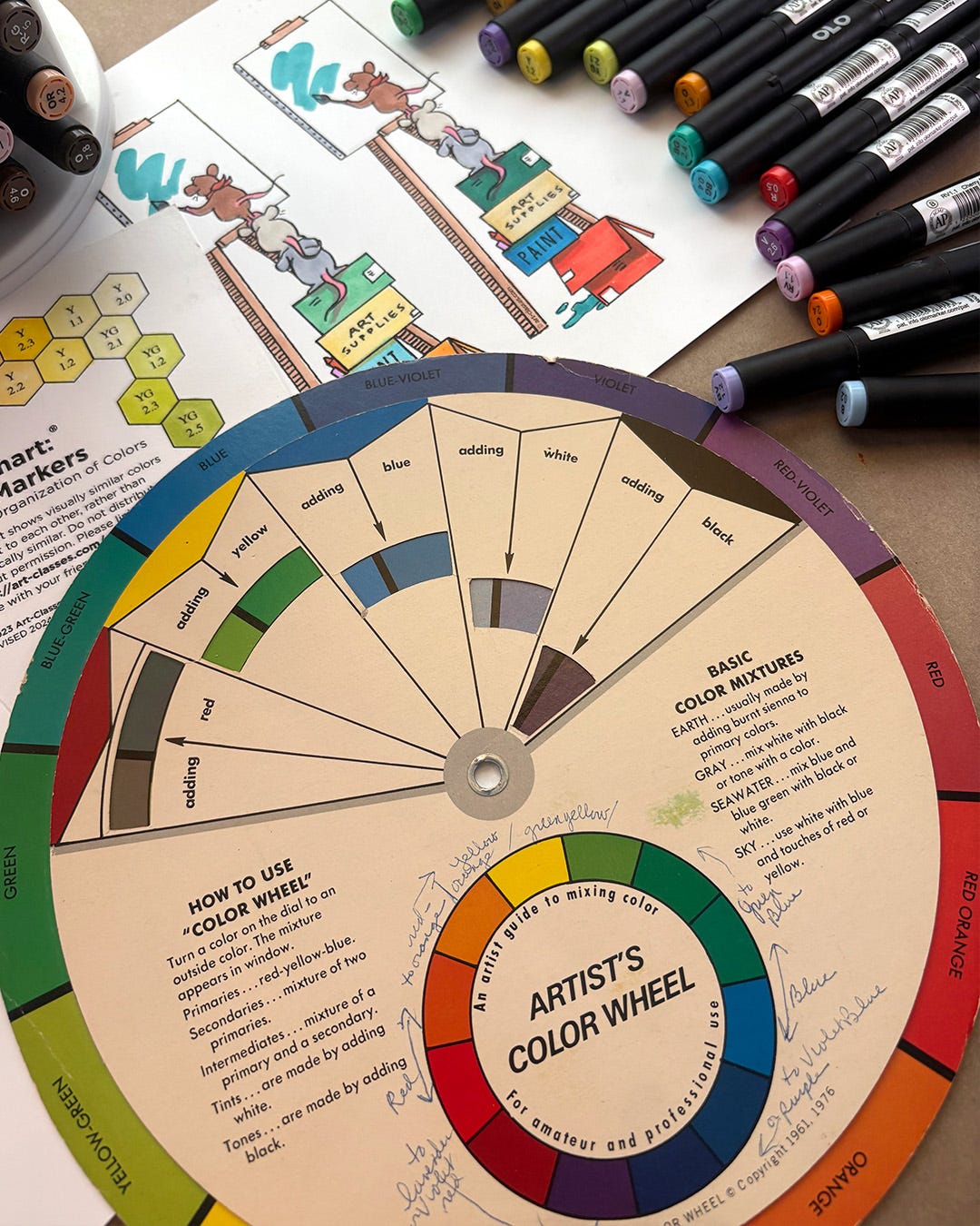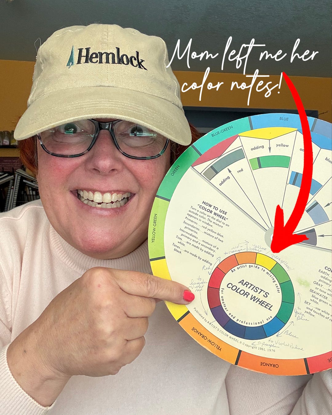 Since it’s my birthday month I warned ya that I’d be adding goodies. And when I rediscovered this old color wheel in a drawer — that had mom’s handwriting on it! — I knew what I’d add as a bonus discussion this week!
