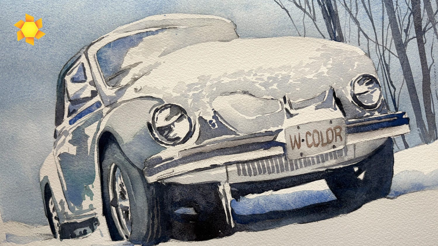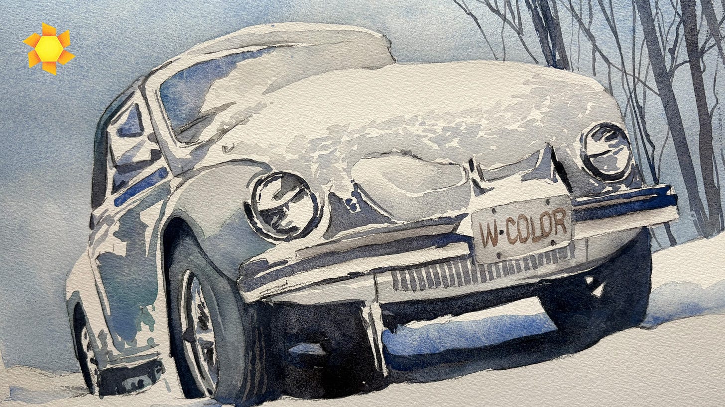 Watercolor a car in the snow